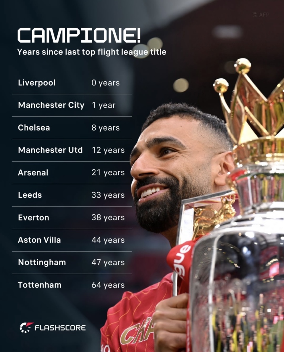 球队距离上次获得顶级联赛冠军的年数